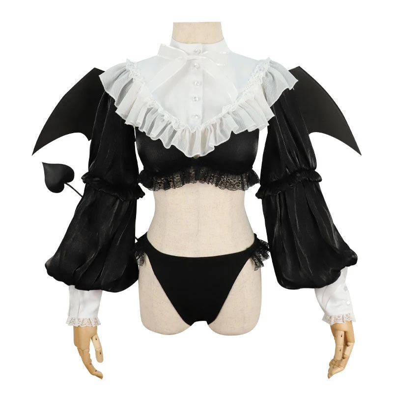 Included: top, panties, chest wrap, horns, ears, tail, wings.